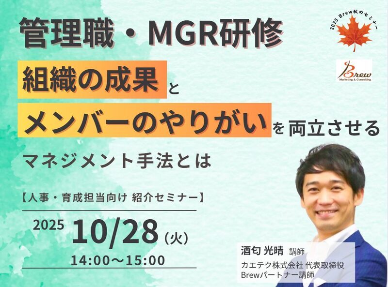 成果を出し続け、部下の主体性を生むマネジメントとは?管理職のマネジメントの中で「目標設定」と「動機付け」は、部下の目標達成へのモチベーションや部下の士気といった組織の成果に大きな影響を与えます。 組織の成果を出し続け、かつ部下に活き活きと働いてもらうためには、部下が「納得できる」目標設定、そして部下が主体的に働きがいを持てるような「動機付け」が今後のマネージャーに求められます。逆に適切な目標設定や動機付けができていないと、上司や会社の方針に納得できず、エンゲージメント低下にもつながりかねません。 そこで本セミナーでは、適切な目標設定や動機付けをいかに行うべきか?明日から実践できるメンバーの「納得」と「働きがい」を生むマネジメントスキルをどのように習得するかをご紹介いたします。 セミナーの特徴(1) 講師が事業会社でのマネジメント経験や失敗談からお伝えします リクルートグループ出身で、営業組織や事業のマネジメントの経験から、失敗談から成功事例を交えてポイントを押さえてお伝えします。 (2)若手から管理職までの研修実績を持つ講師 担当講師は若手から管理職まで、幅広い層への研修を実施してきました。明日から実践できるコツやヒントをお伝えします。 こんな方におすすめ・メンバーの目標達成意欲が低く、業績が伸び悩んでいるマネージャー・管理職 講師紹介酒匂 光晴カエテク株式会社 代表取締役 1981年2月23日 鹿児島県生まれ。 プログラム1.本研修の概要と講師紹介(14:00~14:05) |